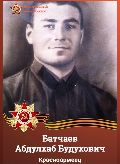 Батчаев Абдулхаб Будухович 1916-2007 года, место рождения а. Карт-Джурт, Карачаевского района, Ставропольского края, призван в РККА с сентября 1939 года в Учкуланском РВК Карачаевской АО, место службы, Закавказский фронт 15 кавалерийский корпус, дед судьи Урусова Энвера Долхатовича. Начал службу на Украине: Участвовал в обороне левого берега р. Прут от превосходящих сил вермахта и румынских войск. Участвовал в обороне Одессы, Крыма, 22.11.1941г. Был ранен осколком в область поясницы при обороне Севастополя. После выздоровления был переведён в 15-й кавалерийский корпус в Иране. Принимал участие в обеспечении безопасности лидеров стран антифашисткой коалиции во время Тегеранской конференции. В 1991 году уполномоченным советом по делам религий по Карачаево-Черкесской Автономной области Батчаев А.Б. назначен имам-хатыбом религиозной общины мусульман станицы Зеленчукской с правом совершать все религиозные обряды, предусмотренные исламом. Награжден -«За боевые заслуги» -«За оборону Одессы» -«За оборону Севастополя» -Юбилейная медаль «Двадцать лет Победы в Великой Отечественной Войне 1941-1945гг» -Медаль Жукова -Юбилейная медаль «Сорок лет Победы в Великой Отечественной Войне 1941-1945гг» -Юбилейная медаль «50 лет Победы в Великой Отечественной Войне 1941-1945гг» -Юбилейная медаль «60 лет Победы в Великой Отечественной Войне 1941-1945гг» -Юбилейная медаль «50 лет Вооруженных сил СССР» - Юбилейная медаль «60 лет Победы в Великой Отечественной Войне 1941-1945гг» -Орден отечественной войны II степени за храбрость, стойкость и мужество, проявленные в борьбе с немецко-фашистскими захватчиками. 30 Апреля 2007 года, похоронен в ст. Зеленчукской Зеленчукского района Карачаево-Черкесской Республики.