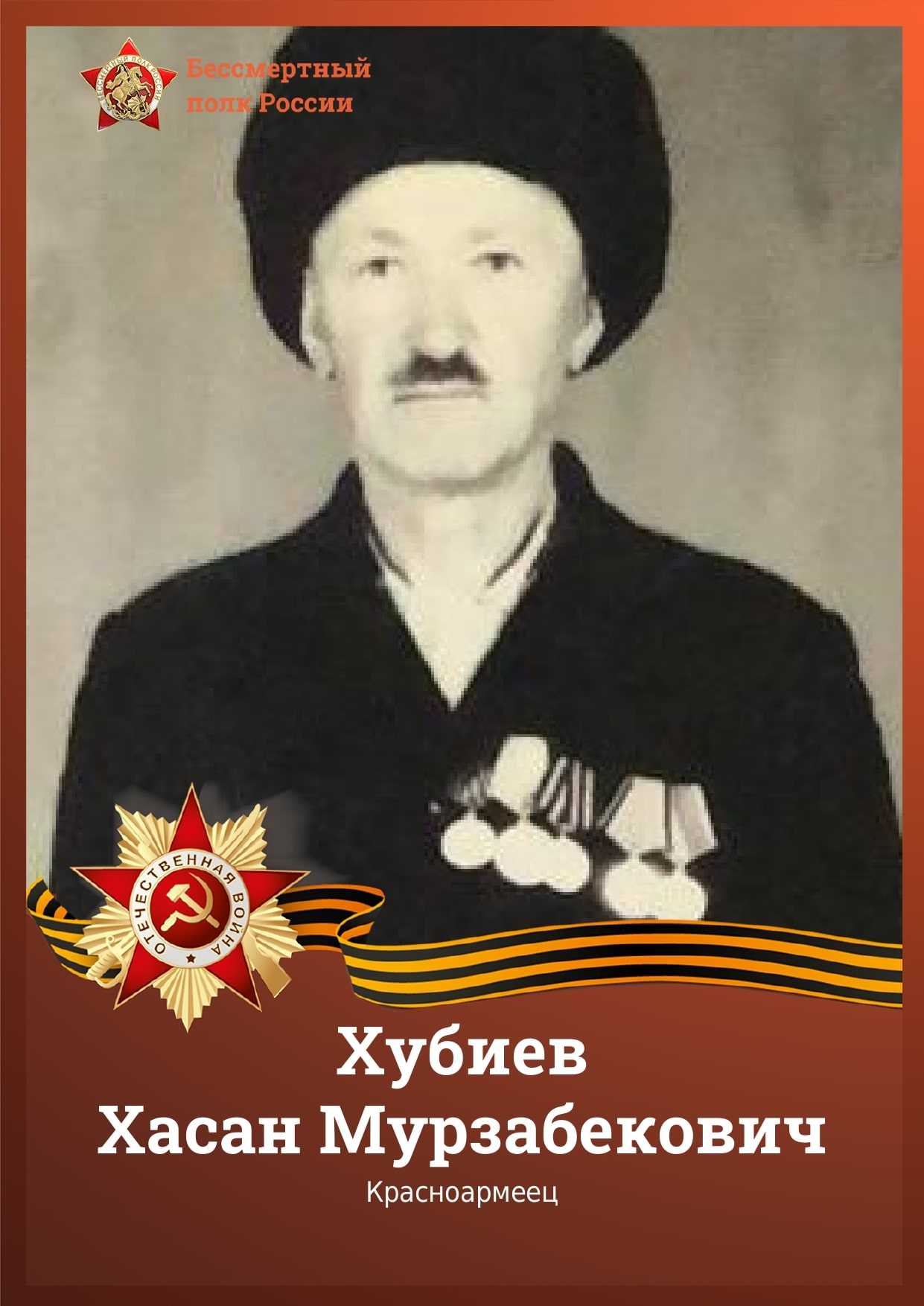 Хубиев Хасан Мурзабекович 1910-1994 года, место рождения а. Карт-Джурт Карачаево-Черкесской автономной области, места службы в/ч 73953, дед помощника судьи Кочкарова Руслана Османовича. После окончания Великой Отечественной Войны Хасан Мурзабекович долго искал свою семью. Одна из местных жительниц сообщила ему, что все члены его семья высланы в Казахстан. Там он и нашел свою семью. В 1952 год он прошел трехлетние курсы по подготовке мастеров сельского хозяйства, стал членом сельскохозяйственной артели им. Сталина Джамбульского района, Джамбульской области Р.Казахстан, где и работал по специальности. За достижения в сельском хозяйстве, в том числе по раздою коров Хасану Мурзабековичу был присужден диплом второй степени и свидетельство участника областной сельскохозяйственной выставки. За освоение целинных земель 20 октября 1956 года - награжден медалью от имени Президиума Верховного Совета СССР. В 1957 году он вместе со своей семьей вернулся на Родину, где продолжил трудовую деятельность в колхозе «Знамя Коммунизма» - дояром. За безупречную работу и высокие надои молока награжден премиями, грамотами, благодарственными письмами, присуждено звание «Почетный колхозник». Награды Благодарность Маршала Советского Союза Г.К. Жукова "За честную службу на благо Родины" Благодарность И.В. Сталина Медаль «За боевые заслуги» Медаль «За взятие Берлина» Медаль «За отвагу» Орден отечественной войны II степени за храбрость, стойкость и мужество, проявленные в борьбе с немецко-фашистскими захватчиками. В 1994 году похоронен на мусульманском кладбище станицы Кардоникской Карачаево-Черкесской Республики.