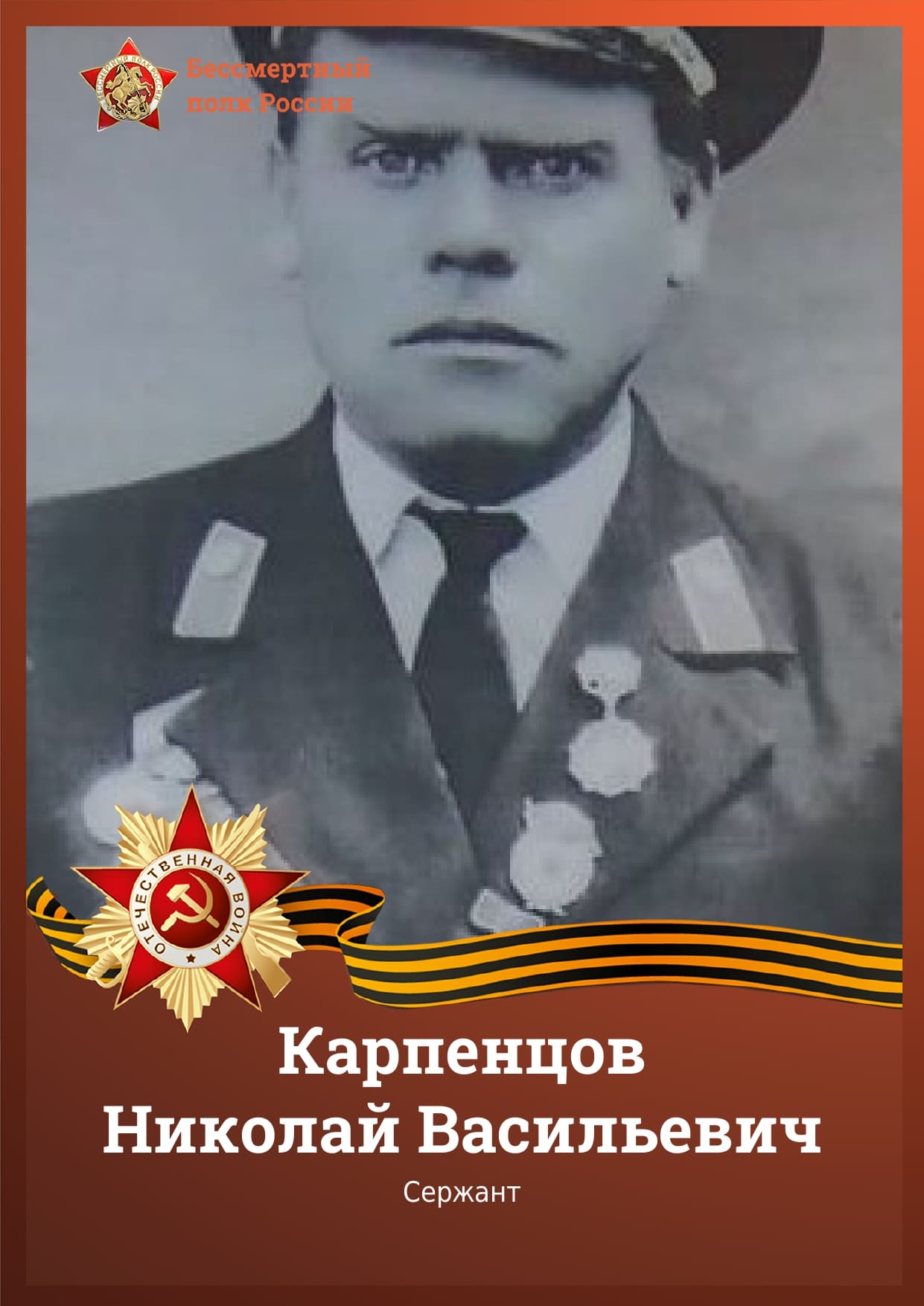 Карпенцов Николай Васильевич 1926-1986 года место рождения Ставропольский край, станица Зеленчукская, место призыва Дмитриевский РВК, Ставропольский край, Дмитриевский р-н, место службы 32 гвардейский кавалерийский полк 9 гвардейской кавалерийской дивизии, дед секретаря судебного заседания Сарафановой Анастасии Сергеевны. Карпенцов Николай Васильевич родился 15.05.1926 году в ст. Зеленчукской, учился в 1-ой школе. В июне месяце 1942 года пошол на фронт, ему исполнилось только 16 лет. Воевал в войсковой разведке коваллерийского кубанского казачьего полка: в/ч: 32 гв. КАЗКП 9 гв. Прошел всю войну и пол мира, начиная с Украины, был в Румынии, Венгрии, Чехии и с 06.05.1945 по 11.05.1945 освобождал в Чехословакии г. Прага. Потом их полк перебросили в Иран, и в 1946 г - вернулся домой, в звании сержанта. Был награжден медалями: за Боевые заслуги, за Освобождение Городов, орденом Отечественной войны 2 степени, 25.10.1944 г. медалью за «Отвагу», и 15.05.1945 г. орденом «Славы», за спасение своего тяжелораненого командира. Награды Медаль «За отвагу» Орден Славы III степени Орден Славы III степени Медаль «За отвагу». Похоронен в ст.Зеленчукской Карачаево-Черкесской Республики 27.01.1986 году.