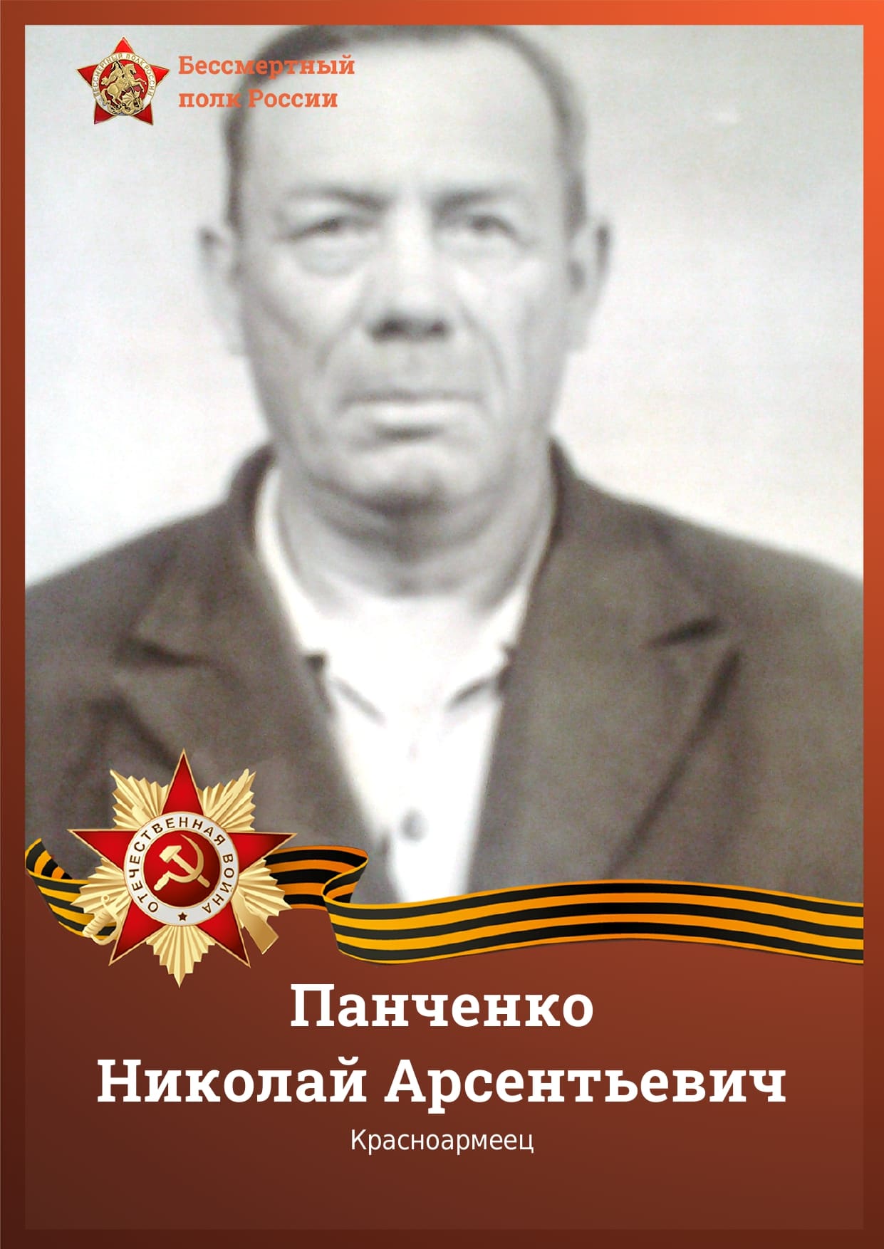 Панченко Николай Арсентьевич 1925-1998 года, место рождения ст. Зеленчукская Орджоникидзевского края, место призыва 12.01.1943 Зеленчукский РВК, Карачаевская АО, Зеленчукский р-н, место службы 295 стрелковая дивизия, прадед консультанта суда Гречкиной Юлии Валерьевны. Панченко Николай Арсентьевич родился в обычной семье. В январе 1943 года был призван на военную службу. В апреле1943 года пропал без вести в х.Садовый Киевского с/с, Крымского района Краснодарского края. Получил осколочное ранение в области бедра, после длительного лечения вернулся домой в ст.Зеленчукскую в мае 1945 года. Награды Указном президиума верховного совета СССР от 11.03.1985 года награжден: Орденом отечественной войны II степени за храбрость, стойкость и мужество, проявленные в борьбе с немецко-фашистскими захватчиками и ознаменование 40-летия победы советского народа в великой отечественной войне 1941-1945 годов. Медалями: - к 30-летию победы в ВОВ 1945-1975 г.г. - к 40-летию победы в ВОВ 1945-1985 г.г. - к 70-летию вооруженных сил СССР 1918-1988 г.г. - медалью Георгия Жукова 1985-1996 г.г. - к 50-летию победы в ВОВ 1945-1996 г.г. Похоронен 25 марта 1998 года, в ст.Зеленчукской.