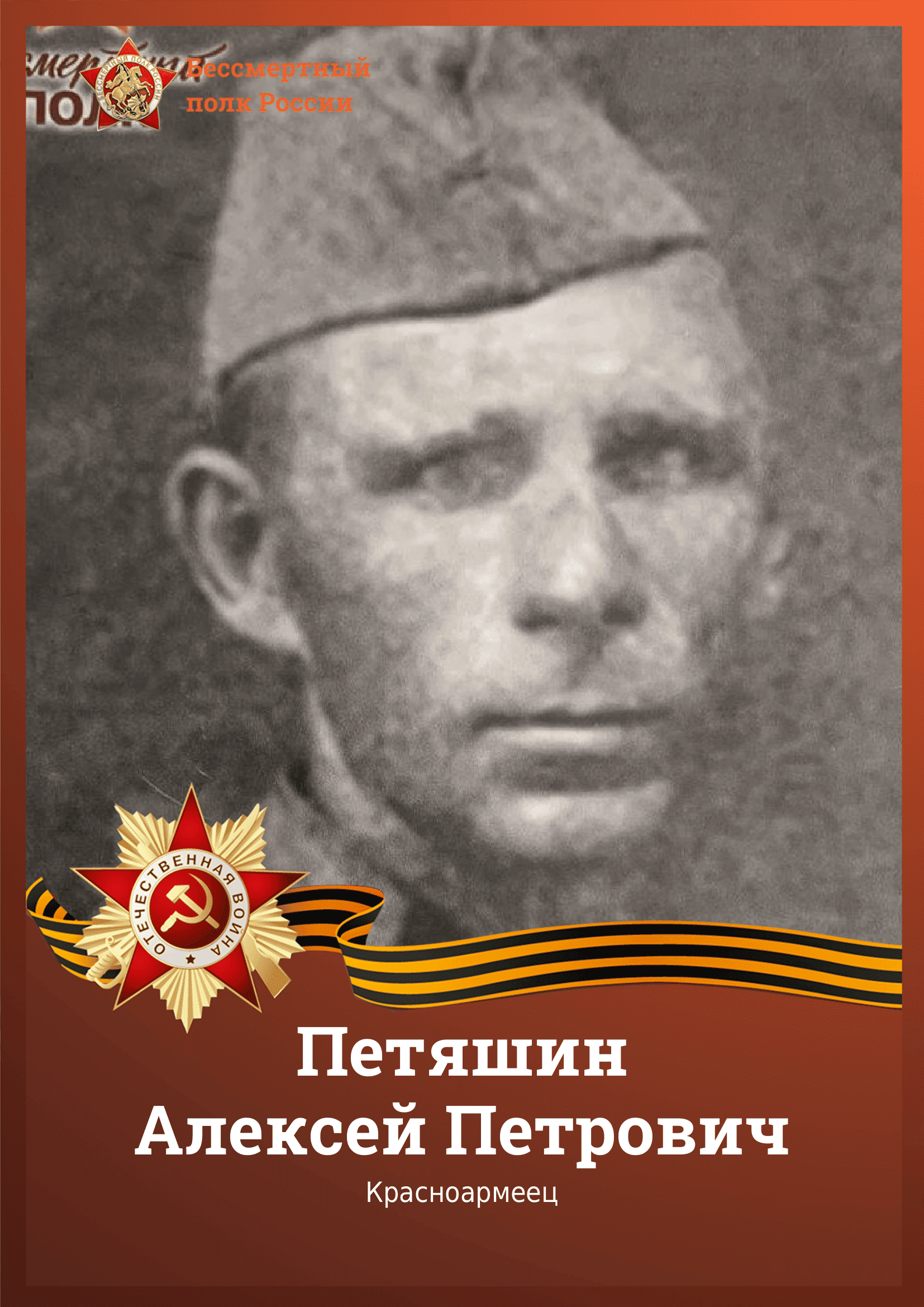 Петяшин Алексей Петрович 1909-1943 года, место рождения Ст. Надежная, Спокойненский район, Краснодарский край, место службы Удобненский РВК, воинское звание красноармеец, санитар. Прадед судьи Петяшина Александра Александровича. Пропал без вести в апреле 1943 года.