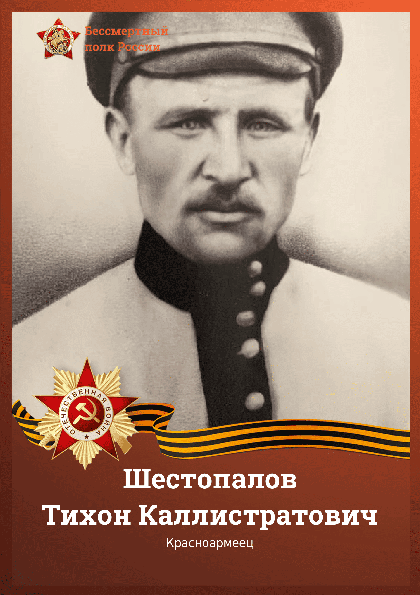 Шестопалов Тихон Каллистратович 1895-1943 года, место рождения Краснодарский край, Спокойненский р-н, ст. Надежная, место призыва Спокойненский РВК, Краснодарский край, Спокойненский р-н, место службы 42 гвардейский кавалерийский полк 10 гвардейской кавалерийской дивизии 12 гвардейский кавалерийский полк 3 гвардейской кавалерийской дивизии прадед судьи Петяшина Александра Александровича. 30 февраля 1943 года, похоронен в Ростовской обл., Зимовниковский р-н, ст. Зимовники, х. Кучма, с западной стороны ул. Кладбищенская, в конце ул. Степная, кладбище, могила № 4.