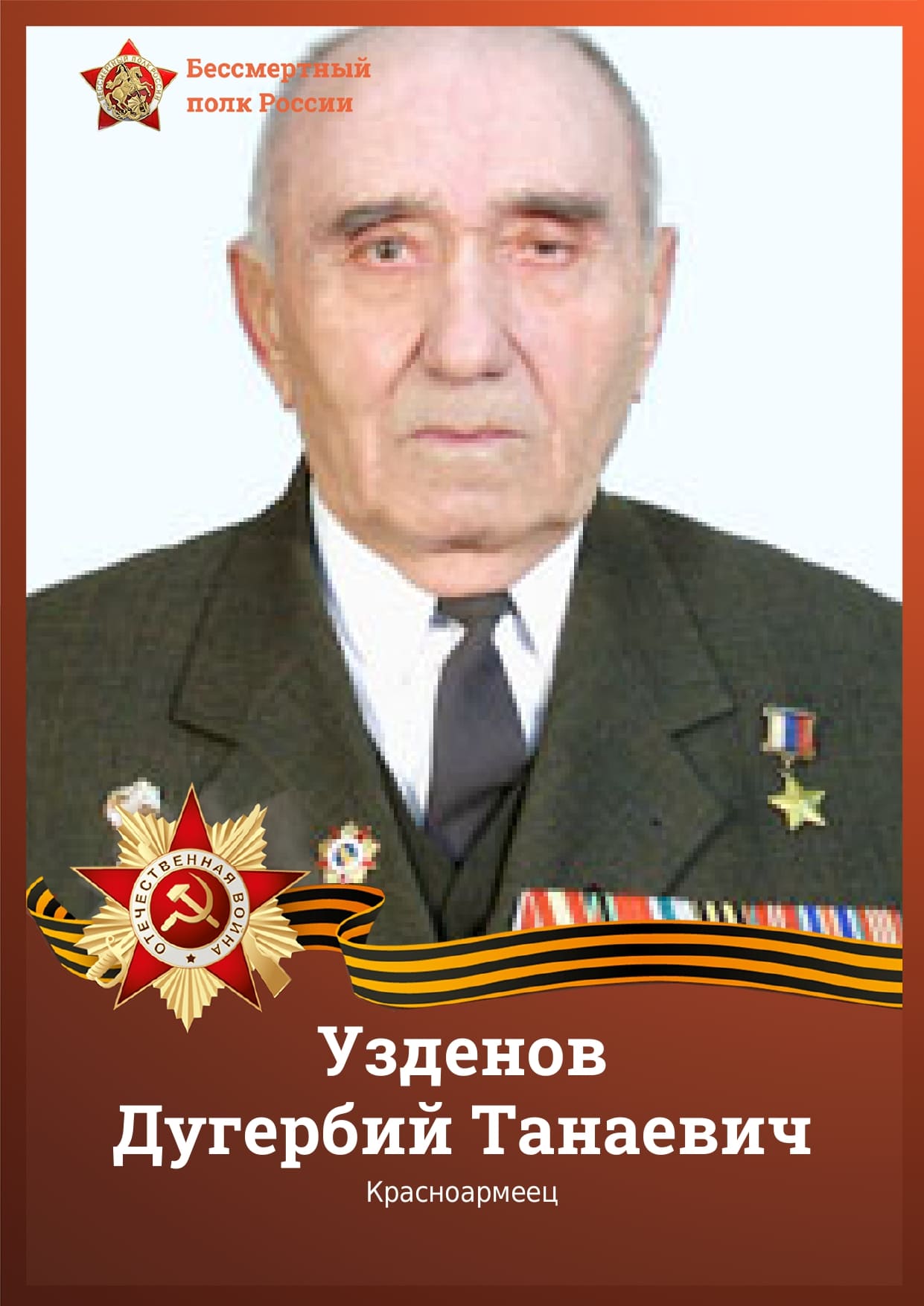 Узденов Дугербий Танаевич 1917-2005 года, место рождения Орджоникидзевский край, Карачаевская АО, г. Микоян-Шахар ; Ставропольский край, Карачаевский р-н, а. Каменномост, место призыва 1 октября 1937 года, место службы в/ч 1046, Разведывательное управление Генерального штаба Красной Армии, прадед помощника судьи Болуровой Мадины Касымовны. Узденов Дугербий Танаевич родился 20 сентября 1917 года в ауле Каменномост (Ташкепюр) Микояновского района Карачаевской автономной области. В сентябре 1937 года был призван в Красную Армию. В 1939 году окончил Тамбовское Краснознаменное кавалерийское училище имени 1-й Конной армии. Участник советско-финляндской войны 1939-40 годов. Командовал разведывательным взводом, был ранен.Участник Великой Отечественной войны с 22 июня 1941 года. Будучи командиром сабельного эскадрона, вступил в бой с вражескими войсками на Петрозаводском направлении фронта (Карелия), был тяжело ранен и несколько месяцев лечился в Перми. В июле–сентябре 1944 года Дугербий Узденов одним из первых советских офицеров побывал в Польше, где был заместителем по разведке командира одного из местных партизанских отрядов. Скончался 7 июня 2005 года. Похоронен в Карачаевске. Награды Орден Красного Знамени Орден Отечественной ойны I степени Медаль «Партизану Отечественной войны» I степени Орден Отечественной войны II степени. 7 июня 2005 года. Похоронен в г. Карачаевске.