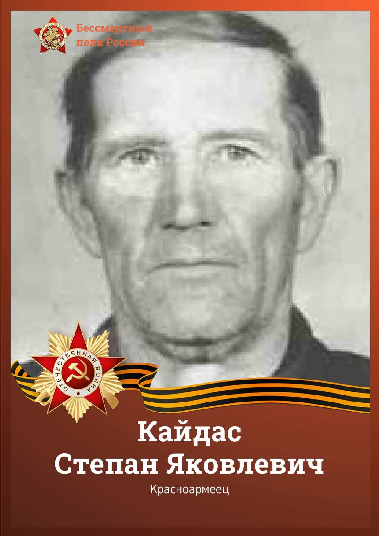 Кайдас Степан Яковлевич 1915-2002 года место рождения с. Маруха, Зеленчукский р-н, Ставропольский край, место призыва 1939 год, Зеленчукский РВК, Орджоникидзевский край, Карачаевская АО, Зеленчукский р-н, дед секретаря суда Кайдас Любови Николаевны. Кайдас Степан Яковлевич участник Великой Отечественной Войны родился в феврале 1915 года, в С. Маруха Зеленчукского района, умер 6 июля 2002 года. Был призван Зеленчукский РВК, Орджоникидзевский край, Карачаевская АО, Зеленчукский р-н, 1939 году, в/ч 5374. Награжден: Орденом отечественной войны II степени за храбрость, стойкость и мужество, проявленные в борьбе с немецко-фашистскими захватчиками. Награды Орден отечественной войны II степени за храбрость, стойкость и мужество, проявленные в борьбе с немецко-фашистскими захватчиками. 6 Июля 2002 года, похоронен в с. Маруха, Зеленчукского района Карачаево-Черкесской Республики.